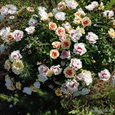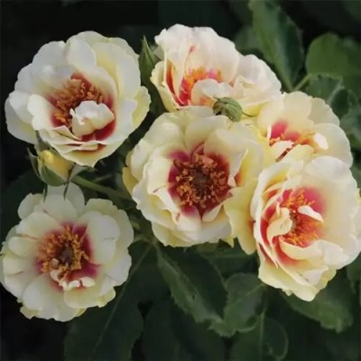 Одним из главных достоинств розы Булс Айс является ее яркая и привлекательная окраска цветков. Они имеют кремовые оттенки слоновой кости и украшены ярко-фиолетовым или клюквенно-красным пятном в центре. Цветение происходит повторно, волнами, на протяжении всего сезона.